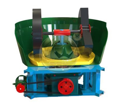 该设备主要由动力装置、机架、水盆、碾轮、碾盘等部件组成,采用轮动式磨矿工作方式:首先电动机将动力传动至减速机,在减速机带动下,通过大立轴将力矩传递给上方的横轴,然后经安装在横轴两端的拉杆传递至碾轮,使碾轮产生驱动力,沿横轴水平方向做逆时针旋转运动;工作时的碾轮既能围绕湿碾机大立轴公转,又能围绕碾轮中心轴进行自转,碾盘则固定不动。添加的矿石物料,在碾磨机内受到来自,碾轮自身重量带来的挤压力,碾轮公转自转时与碾盘产生的巨大摩擦力,在受到反复的挤压、揉搓、研磨后,被彻底粉碎。