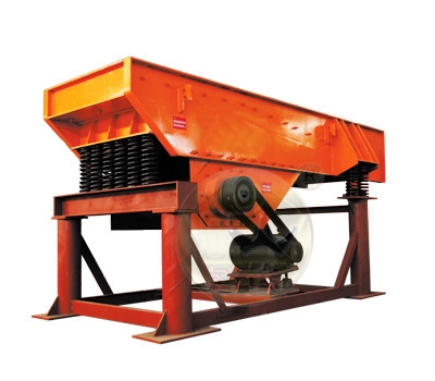 振动给料机主要由振动机架、弹簧、振动器、电机振动架及电机等组成。激振器个是由二特定位置的偏心轴以齿轮相啮合组成,装配时必须使两齿轮按标记相啮合,通过电机驱动,使两偏心轴旋转,从而产生巨大合成的直线激振力,使机体在支承弹簧上作强制振动,物料则以此振动为动力,在料槽上作滑动及抛掷运动,从而使物料前移而达到给料目的。当物料通过槽体上的筛条时,较小的料可通过筛条间隙而落下,可不经过下道的破碎工序,起了筛分的效果,提高了工作效率
